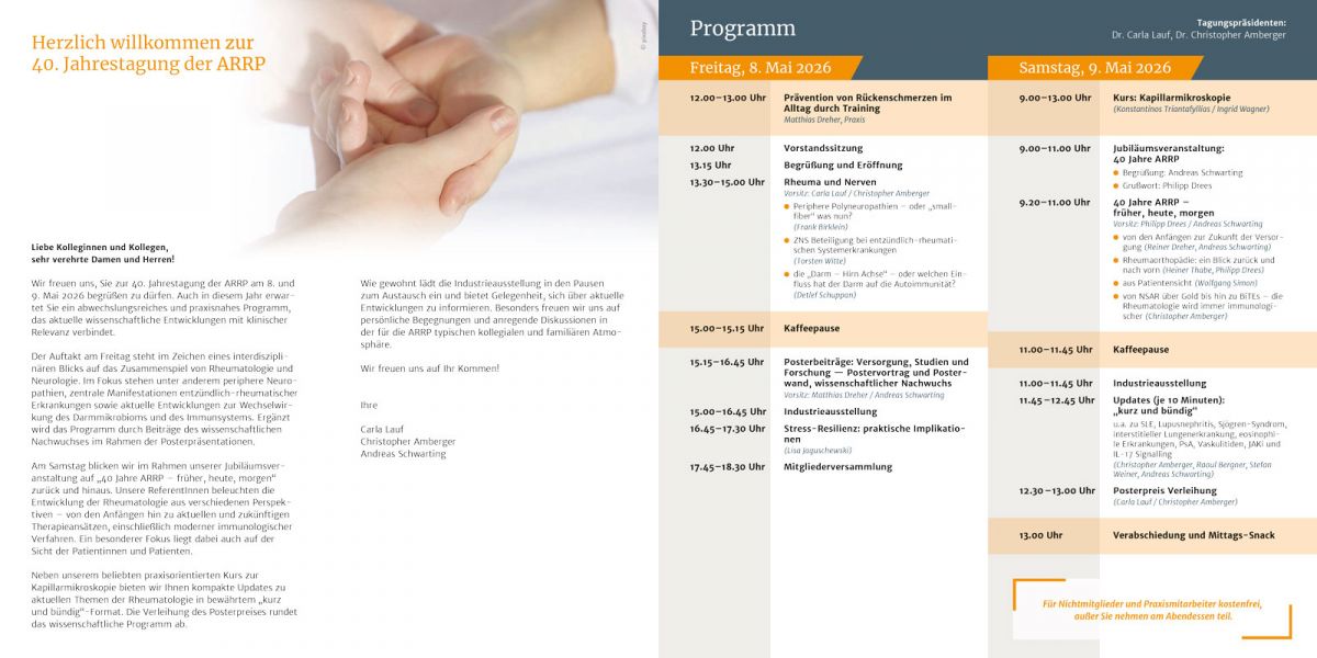Wir freuen uns, Sie zur 40. Jahrestagung der ARRP am 8. und 9. Mai 2026 begrüßen zu dürfen. Auch in diesem Jahr erwartet Sie ein abwechslungsreiches und praxisnahes Programm, das aktuelle wissenschaftliche Entwicklungen mit klinischer Relevanz verbindet.