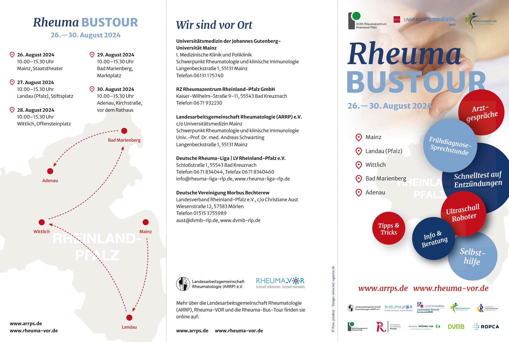 Unter der Schirmherrschaft von Minister Clemens Hoch, Minister für Wissenschaft und Gesundheit des Landes Rheinland-Pfalz, werden in diesem Jahr die Landesarbeitsgemeinschaft Rheumatologie (ARRP) zusammen mit dem Schwerpunkt Rheumatologie der Universitätsmedizin Mainz, dem Rheumazentrum RP in Bad Kreuznach sowie dem Landesverband der Deutschen Rheuma-Liga und dem DVMB an 5 Stationen über rheumatologische Erkrankungen informieren und beraten.
