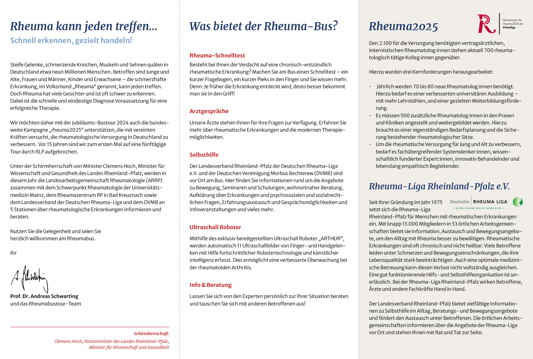 Wir möchten daher mit der Jubiläums-Bustour 2024 auch die bundesweite Kampagne „rheuma2025“ unterstützen, die mit vereinten Kräften versucht, die rheumatologische Versorgung in Deutschland zu verbessern. Vor 15 Jahren sind wir zum ersten Mal auf eine fünftägige Tour durch RLP aufgebrochen.